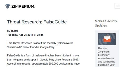 มัลแวร์ FalseGuard ถูกตรวจพบ(อีกครั้ง) หลังจากที่มันซ่อนตัวอยู่ในแอพกว่า 40 แอพบน Google Play ตั้งแต่เดือนกุมภาพันธ์ทีผ่านมา Zimperium ประเมินว่ามีอุปกรณ์ที่ติดเชื้อแล้วจาก FalseGaurd "เฉพาะรุ่นที่ถูกตรวจพบ" ประมาณ 600,000 รายการ