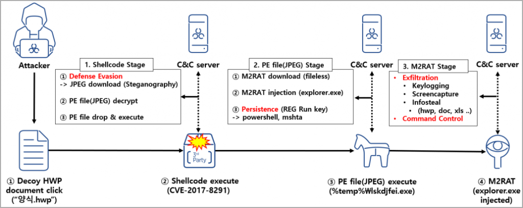เมื่อมีการเปิดไฟล์แนบจะทำให้เกิดการโจมตีโดยใช้ประโยชน์จากช่องโหว่ EPS (CVE-2017-8291) ในโปรแกรม Hangul word processor ซึ่งนิยมใช้กันทั่วไปในเกาหลีใต้ ซึ่งช่องโหว่นี้จะทำให้ shellcode เริ่มทำงานบนคอมพิวเตอร์ของเหยื่อ และทำการดาวน์โหลด และเรียกใช้โปรแกรมที่เป็นอันตรายซึ่งถูกเก็บไว้ภายในไฟล์ภาพ JPEG