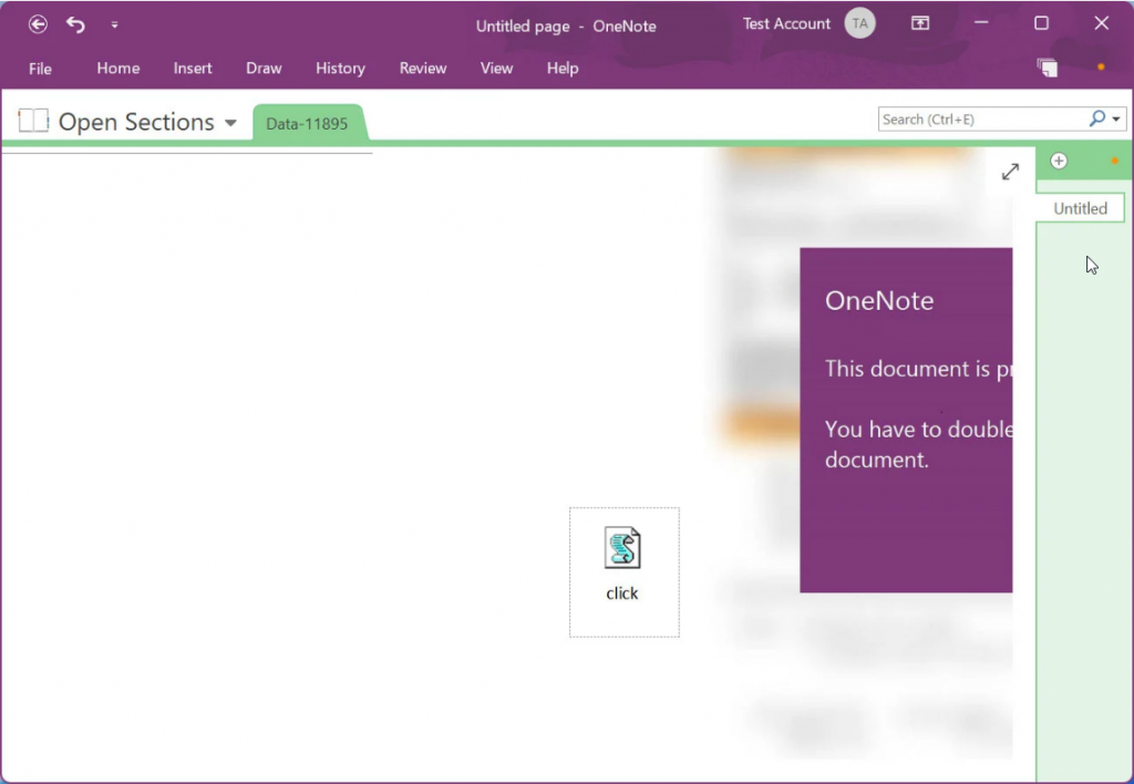 โดยเอกสาร Microsoft OneNote ดังกล่าวจะถูกสร้างองค์ประกอบเพื่อซ่อนไฟล์ VBScript ที่เป็นอันตรายที่เรียกว่า 'click.wsf' ไว้ใต้ปุ่ม 'View'