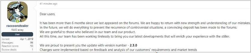 หลังจากที่ผู้พัฒนามัลแวร์ Raccoon Stealer ได้หายไปจาก hacker forums นานกว่า 6 เดือน ล่าสุดได้กลับมาโปรโมตอีกครั้ง พร้อมกับ Raccoon Stealer version 2.3.0