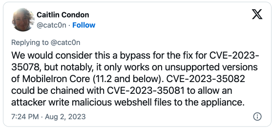 โดยช่องโหว่ดังกล่าวมีหมายเลข CVE-2023-35082 (คะแนน CVSS 10/10 ความรุนแรงระดับ Critical) เป็นช่องโหว่การเข้าถึง API จากระยะไกลโดยไม่ผ่านการตรวจสอบสิทธิ์ ซึ่งทำให้ Hacker สามารถเข้าถึงข้อมูลส่วนบุคคล (PII) ของผู้ใช้อุปกรณ์มือถือ และเซิร์ฟเวอร์ที่ถูกโจมตีจากช่องโหว่ได้ ผ่านทาง web shell เพื่อเรียกใช้ช่องโหว่อื่น ๆ ในการโจมตีต่อไป ซึ่งส่งผลกระทบต่อ MobileIron Core เวอร์ชัน 11.2 และเก่ากว่า