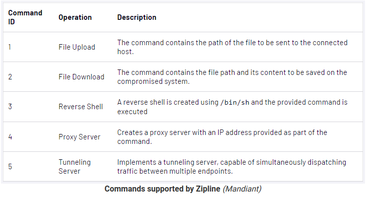 - Zipline Passive Backdoor : custom malware ที่สามารถดักจับการรับส่งข้อมูลเครือข่าย รองรับการอัปโหลด/ดาวน์โหลด การสร้าง reverse shells, proxy servers และ server tunneling