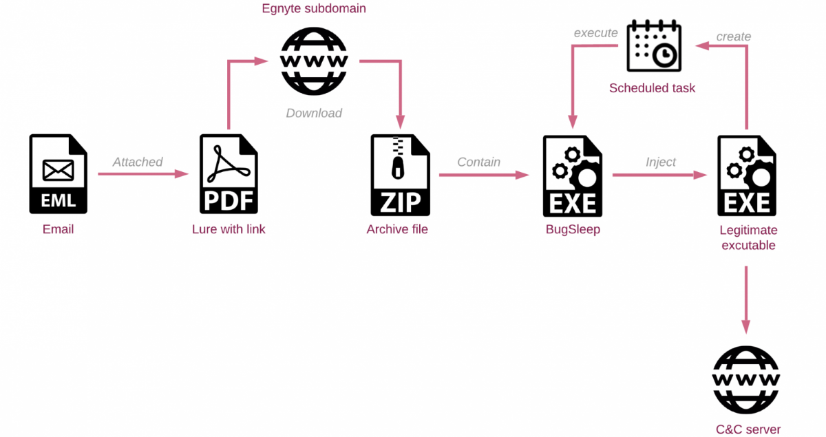แคมเปญนี้ดำเนินการโดยแพร่กระจายมัลแวร์ผ่านทางอีเมล โดยการแอบอ้างว่าเป็นอีเมลเชิญชวนเข้าสัมนา หรือคอร์สออนไลน์ โดยอีเมลเหล่านี้จะหลอกเหยื่อให้คลิกลิ้งที่นำไปสู่การดาวน์โหลด malicious payloads ที่เตรียมไว้บนแพลตฟอร์มไฟล์แชร์ Egnyte secure