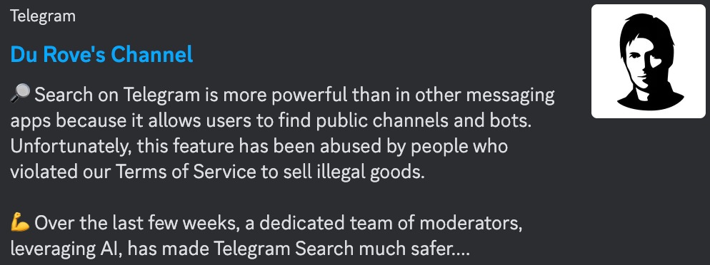 Durov ระบุเพิ่มเติมในวันนี้ว่า “มาตรการเหล่านี้ควรจะช่วยยับยั้งอาชญากร Telegram Search ถูกออกแบบมาเพื่อให้ผู้ใช้ค้นหาเพื่อน และติดตามข่าวสาร ไม่ใช่เพื่อส่งเสริมสินค้าที่ผิดกฎหมาย”