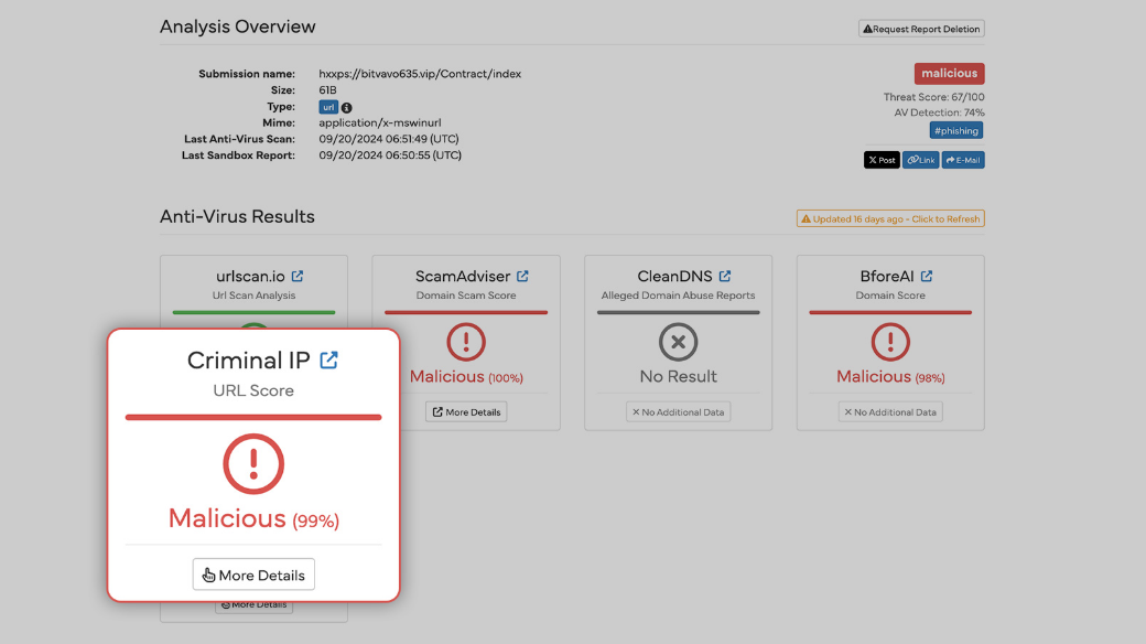 ด้วยการผสมผสานฐานข้อมูลขนาดใหญ่ของ Criminal IP เข้ากับ Hybrid Analysis โดยตรง ผู้ใช้สามารถเข้าถึงโปรไฟล์ของภัยคุกคามที่ได้รับการพัฒนา ซึ่งเพิ่มความแม่นยำในการตรวจจับการโจมตีด้วยการกรอง false positives ออก และให้ข้อมูลเชิงลึกที่สำคัญเกี่ยวกับการโจมตีของโดเมน รวมถึงความสามารถขั้นสูงในการตรวจจับฟิชชิ่งที่ขับเคลื่อนด้วย AI และการระบุลิงก์ที่เป็นอันตราย