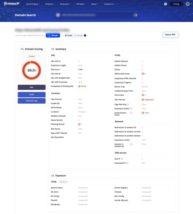 Criminal IP มีความเชี่ยวชาญด้านการสแกนโดเมนแบบเรียลไทม์ โดยใช้ประโยชน์จากข้อมูลเชิงลึกเกี่ยวกับโดเมนเพื่อตรวจสอบโดเมน และ URL เพื่อหาการโจมตีที่อาจเกิดขึ้น เช่น phishing attempts, malware hosting และพฤติกรรมอื่น ๆ ที่น่าสงสัย