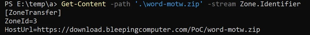 เหตุผลก็คือ เพราะ flag ของ Zone.Identifier จะเก็บข้อมูลจำนวนมากเกี่ยวกับไฟล์ที่ดาวน์โหลดมา รวมถึง Internet Zone (ZoneID) ที่ดาวน์โหลดมา, URL ของไฟล์, URL ที่เชื่อมโยงไปยังไฟล์นั้น และในบางกรณี อาจรวมถึงที่อยู่ IP ของโฮสต์ที่ไฟล์ถูกดาวน์โหลดมา