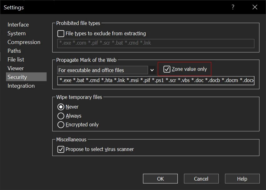 สำหรับผู้ที่ต้องการเปิดใช้งานการถ่ายทอดข้อมูล MoTW อย่างสมบูรณ์ คุณจะต้องเข้าไปที่การตั้งค่าใน WinRAR > Security แล้วยกเลิกการเลือก "Zone value only"
