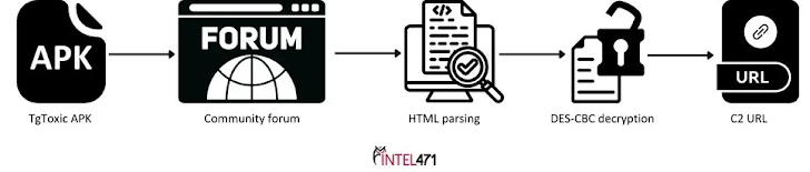 ไฟล์ APK ของ TgToxic ถูกออกแบบมาให้สุ่มเลือกหนึ่งใน URL ของฟอรัมที่มีการกำหนดค่าไว้ ซึ่งจะทำหน้าที่เป็น "dead drop resolver" เพื่อค้นหาโดเมนของ C2 server