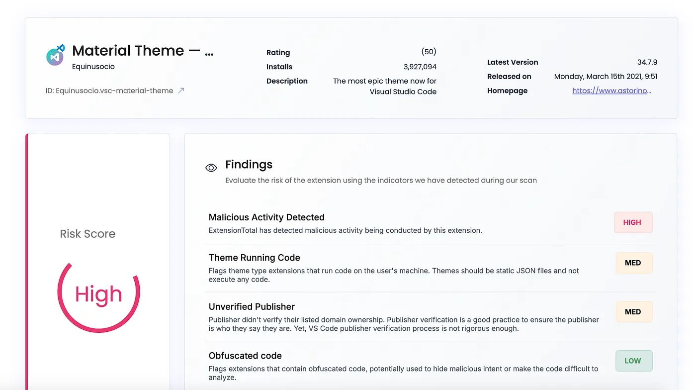 นักวิจัยพบว่าธีมใน VS Code ควรจะประกอบไปด้วยไฟล์ JSON ที่เป็นข้อมูลสถิติตามปกติ ไม่ควรมีการเรียกโค้ด หรือสคริปต์ใด ๆ ดังนั้นการซ่อน JavaScript ภายใน extensions เหล่านี้จึงเป็นสัญญาณอันตรายที่สำคัญ