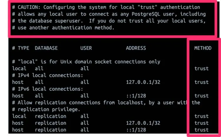 โดยเฉพาะไฟล์ PostgreSQL authentication (pg_hba.conf) ถูกตั้งค่าให้อนุญาตให้ผู้ใช้ในระดับ local สามารถ connect เป็นผู้ใช้ PostgreSQL ใดก็ได้ โดยไม่ต้องใช้รหัสผ่าน ซึ่งสามารถถูกใช้ประโยชน์เพื่อการเรียกใช้โค้ดที่เป็นอันตรายจากระยะไกลได้