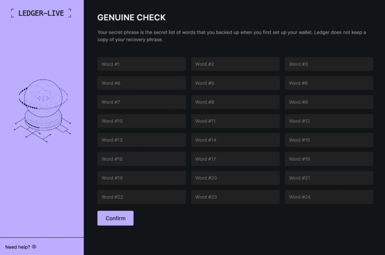 ความจำเป็นต้องใช้ seed phrase ก็ต่อเมื่อกำลังกู้คืน wallet ของคุณ หรือกำลังตั้งค่าอุปกรณ์ใหม่ของคุณเท่านั้น และถึงแม้ในกรณีดังกล่าว seed phrase นี้จะต้องถูกกรอกผ่านบนตัวอุปกรณ์ Ledger จริงเท่านั้น ไม่ใช่ผ่านแอปพลิเคชันหรือเว็บไซต์ใด ๆ ทั้งสิ้น