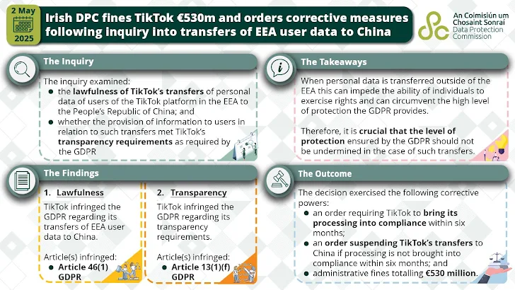 เมื่อวันศุกร์ที่ผ่านมา คณะกรรมการคุ้มครองข้อมูลของไอร์แลนด์ (DPC) ได้สั่งปรับ TikTok เป็นเงินจำนวน 530 ล้านยูโร (601 ล้านดอลลาร์) เนื่องจากการละเมิดข้อบังคับการคุ้มครองข้อมูลในภูมิภาคโดยการโอนข้อมูลของผู้ใช้ในยุโรปไปยังประเทศจีน