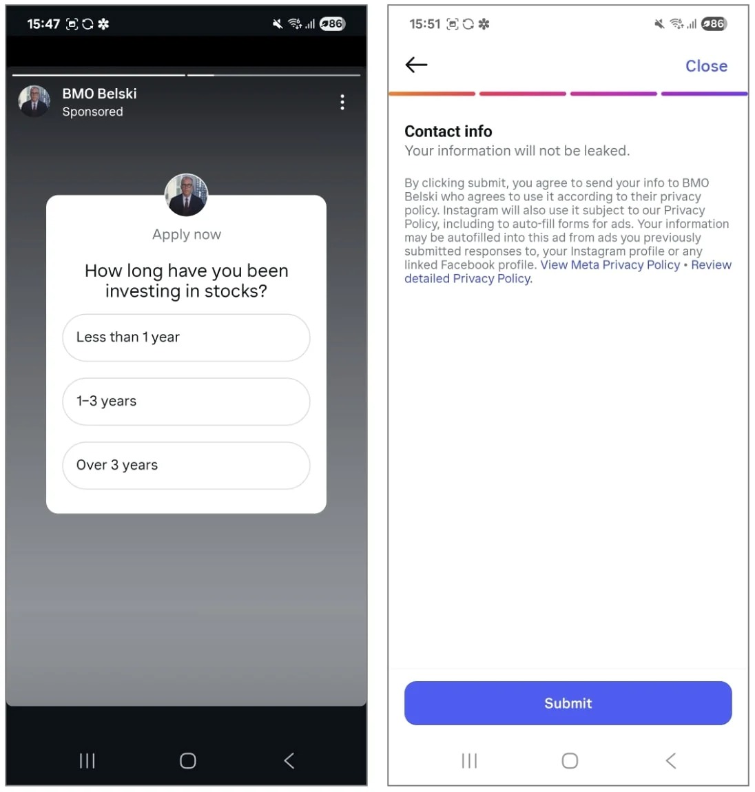 โฆษณาปลอมชื่อ "BMO Belski" ถูกพบในรูปแบบสตอรี่บน Instagram พร้อมคำถาม เช่น "How long have you been investing in stocks?" แม้ว่าวิธีนี้จะเป็นเทคนิคทั่วไปที่นักการตลาดใช้เพื่อประเมินผู้สนใจ แต่ในกรณีนี้ ผู้ใช้งานกลับถูกนำไปยังหน้าที่ให้กรอกข้อมูลติดต่อส่งตรงถึง 'BMO Belski'