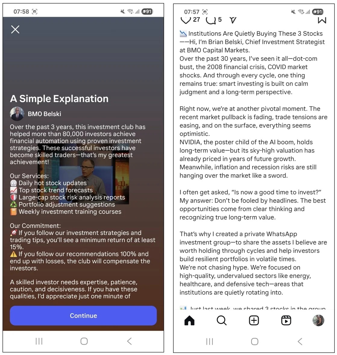 โฆษณาดังกล่าวมีความแนบเนียน ไม่เพียงแค่แอบอ้างชื่อ BMO แต่ยังบ่งบอกถึงความเกี่ยวข้องกับ Brian Belski หัวหน้านักกลยุทธ์การลงทุนของธนาคาร ซึ่งอาจทำให้ผู้ใช้งานทั่วไปหลงเชื่อว่าเป็นคำแนะนำด้านการเงินจากผู้เชี่ยวชาญตัวจริง