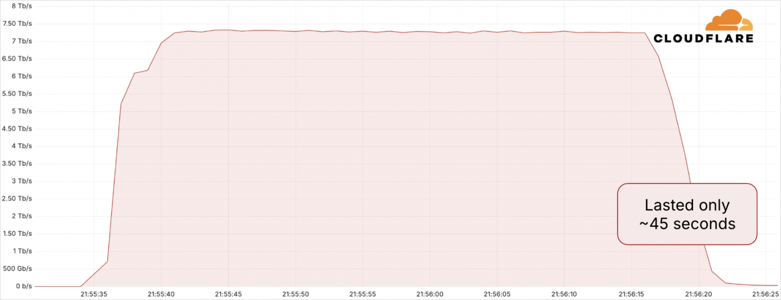 การโจมตีครั้งใหม่นี้มีขนาดใหญ่กว่าสถิติเดิมถึง 12% โดยมีการส่งข้อมูลมหาศาลถึง 37.4 TB ภายในเวลาเพียง 45 วินาที ถ้าเทียบเท่ากับการสตรีมมิ่งวิดีโอความละเอียดสูงระดับ HD ก็จะประมาณ 7,500 ชั่วโมง หรือถ้าเป็นรูปภาพ JPEG ก็จะประมาณ 12,500,000 รูป