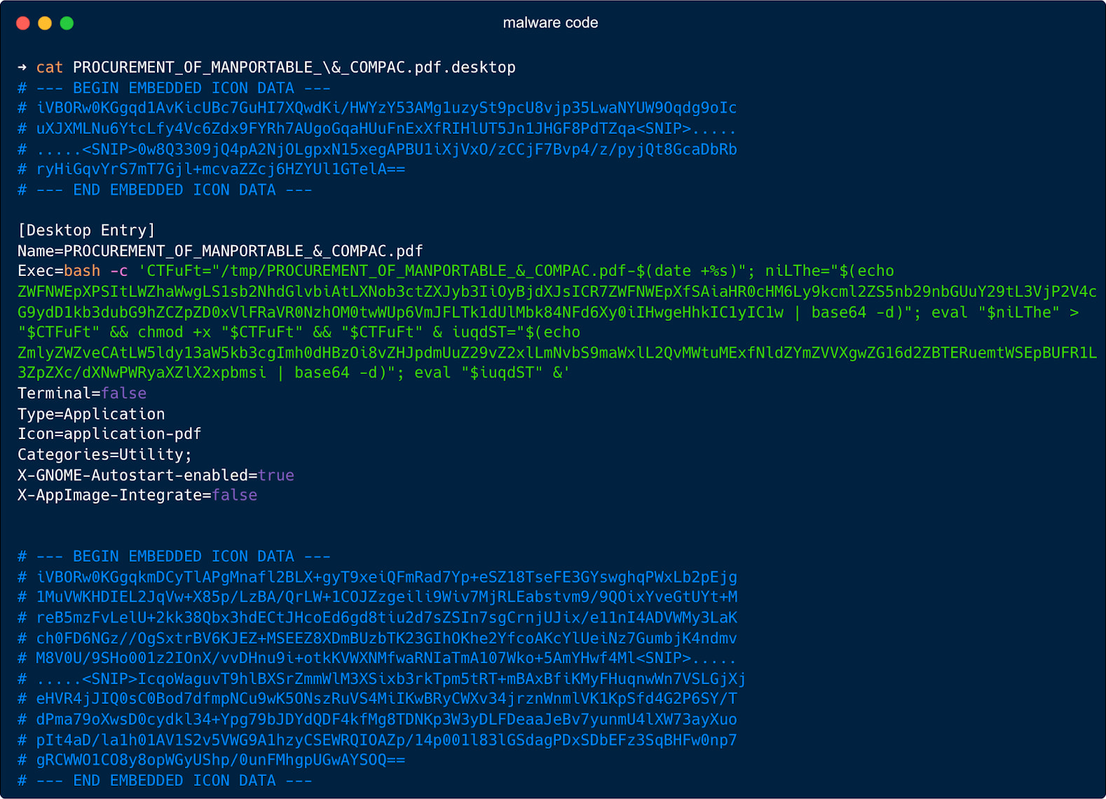 เมื่อผู้ใช้เปิดไฟล์ .desktop โดยคิดว่าเป็นไฟล์ PDF จะส่งผลให้คำสั่ง Bash ที่ซ่อนอยู่ในช่อง 'Exec=' ทำงาน โดยคำสั่งนี้จะสร้างไฟล์ชั่วคราวขึ้นมาในไดเรกทอรี /tmp/ แล้วเขียน Payload ที่ถูกเข้ารหัสแบบ Hex ซึ่งดึงมาจากเซิร์ฟเวอร์ของแฮ็กเกอร์ หรือจาก Google Drive ลงในไฟล์นั้น