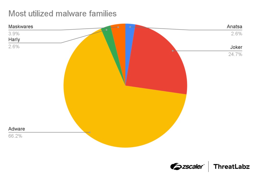แม้ว่ากว่า 66% ของแอปที่เป็นอันตรายจะมีส่วนประกอบของแอดแวร์ แต่ Joker ถือเป็นมัลแวร์บน Android ที่พบบ่อยที่สุด โดยปรากฏในเกือบหนึ่งในสี่ของแอปที่ถูกวิเคราะห์