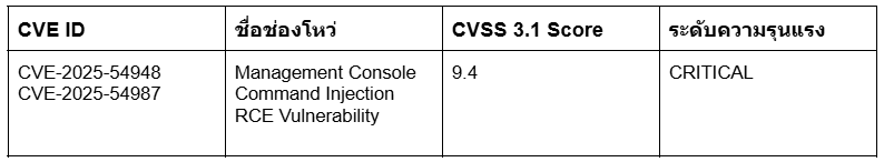 โดยช่องโหว่ทั้งสองรายการมีคะแนน CVSS 3.1 อยู่ที่ 9.4 ซึ่งจัดอยู่ในระดับความรุนแรง Critical โดยเป็นช่องโหว่ประเภท Command Injection ในหมวดหมู่ CWE-78: OS Command Injection ซึ่งอาจทำให้ผู้โจมตีจากภายนอกที่ไม่จำเป็นต้องผ่านการยืนยันตัวตน สามารถอัปโหลดโค้ดอันตราย และรันคำสั่งบนระบบที่มีช่องโหว่ได้