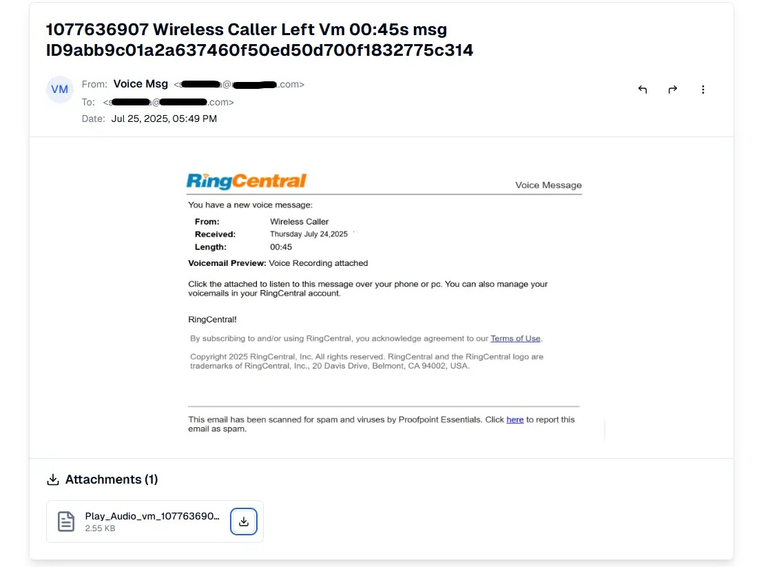 แคมเปญนี้ใช้กลไกการแพร่กระจายมัลแวร์แบบหลายขั้นตอนที่มีความซับซ้อน โดยเริ่มต้นจากการแจ้งเตือนข้อความเสียงผ่านอีเมลที่ดูเหมือนไม่มีอันตรายจากบริการที่น่าเชื่อถืออย่าง RingCentral