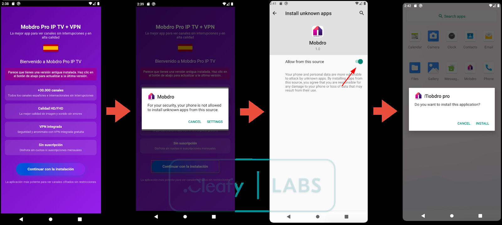 มัลแวร์ดังกล่าวจะแทรกซึมเข้าสู่อุปกรณ์ของเหยื่อผ่านแอปพลิเคชันประเภท Dropper ที่มีชื่อว่า “Modpro IP TV + VPN” ซึ่งมีการเผยแพร่ให้ดาวน์โหลดจากภายนอกที่ไม่ใช่การดาวน์โหลดโดยตรงจาก Google Play