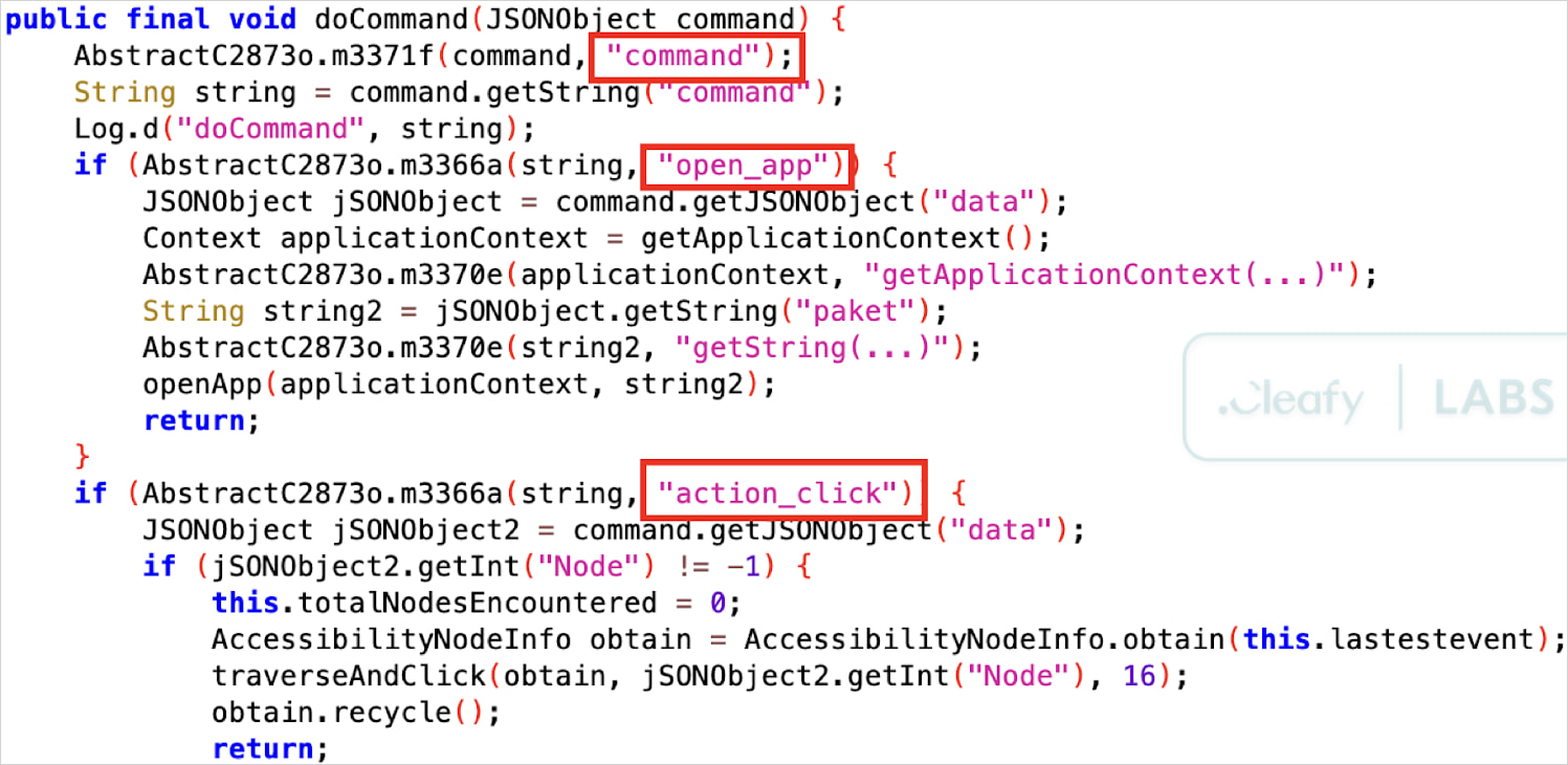 Klopatra ใช้การเข้าถึงจาก Accessibility Service ของ Android เพื่อมอบสิทธิ์การเข้าถึงเพิ่มเติมให้กับตัวเอง, ดักจับข้อมูลที่ผู้ใช้กรอก, จำลอง gesture navigation รวมถึงพยายามตรวจสอบหน้าจอของเหยื่อเพื่อหารหัสผ่าน และข้อมูลที่สำคัญอื่น ๆ