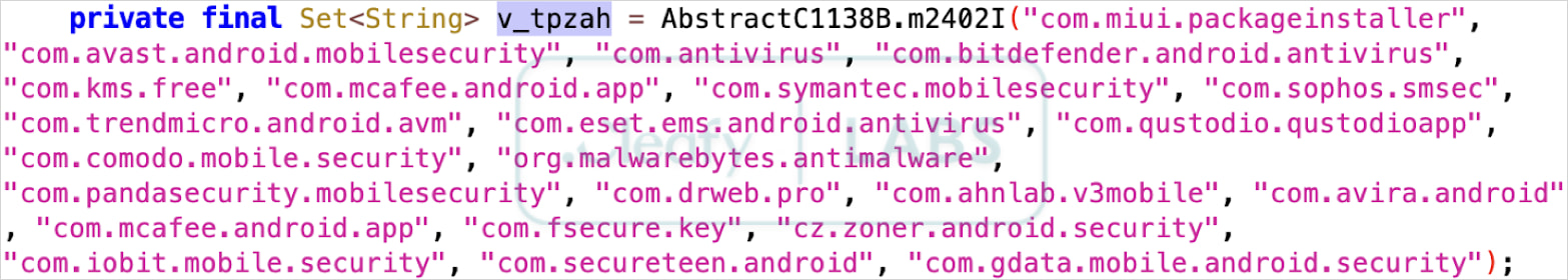 เพื่อหลีกเลี่ยงการถูกตรวจจับ Klopatra ยังมีรายชื่อ "package name" ที่ถูกฝังไว้ในโค้ดโดยตรง ซึ่งเป็นรายชื่อของแอปพลิเคชัน Antivirus ยอดนิยมบน Android และมันจะพยายามถอนการติดตั้งแอปพลิเคชันเหล่านั้นทิ้ง