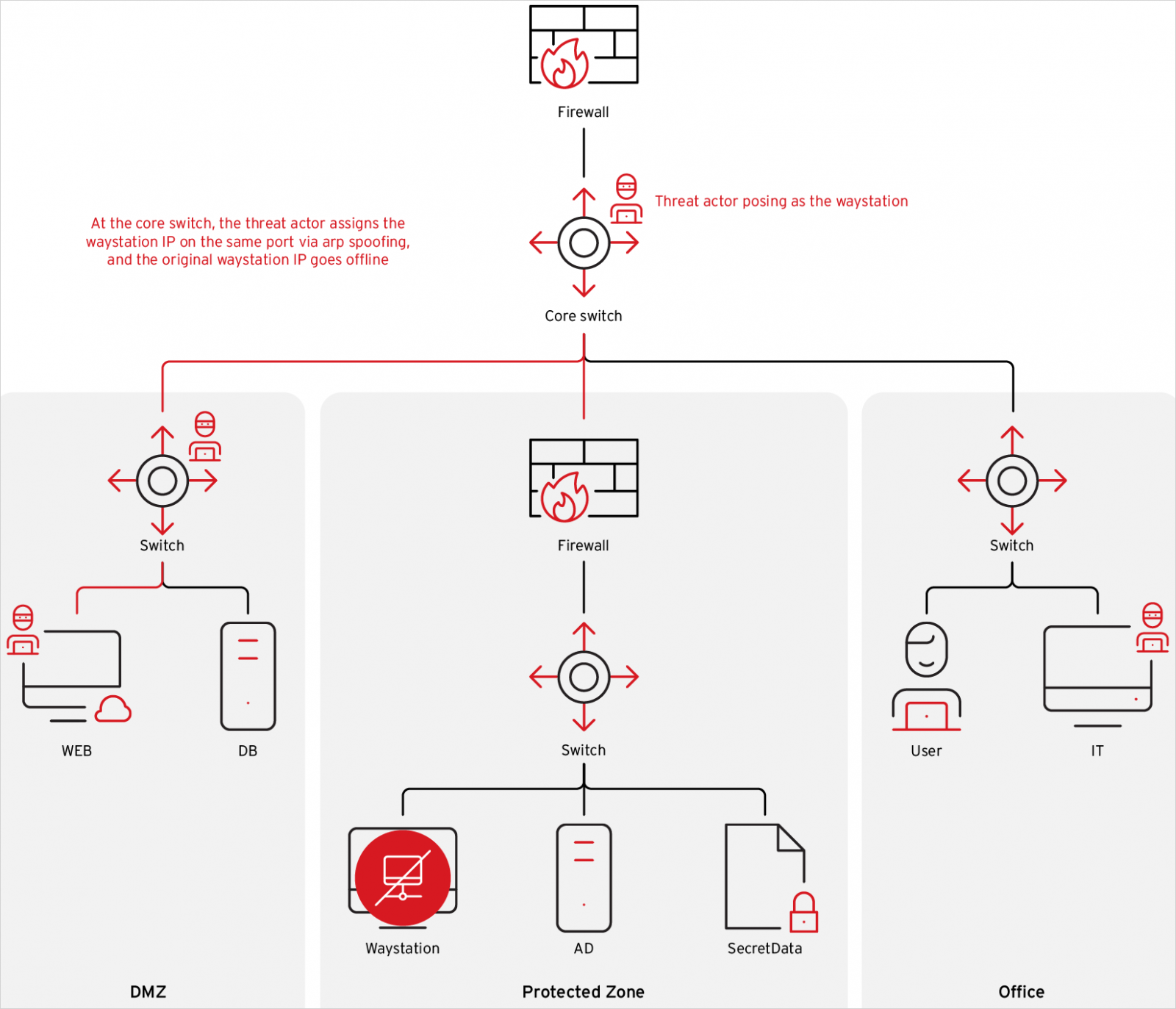 ในการจำลองการโจมตี นักวิจัยแสดงให้เห็นว่ามีความเป็นไปได้ที่จะปิดการบันทึกข้อมูล, ปลอมแปลง IP address ของอุปกรณ์ waystation ผ่านเทคนิค ARP spoofing, bypass rules ของ firewall ภายใน และ lateral ข้าม VLANs ไปยังส่วนอื่น ๆ ได้