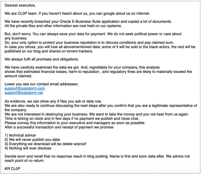 “เราเพิ่งโจมตีไปที่ระบบ Oracle E-Business Suite ของคุณได้สำเร็จ และได้ Copy เอกสารจำนวนมากออกมา ตอนนี้ไฟล์ส่วนตัวทั้งหมด และข้อมูลอื่น ๆ ของคุณถูกเก็บอยู่ในระบบของเราแล้ว”