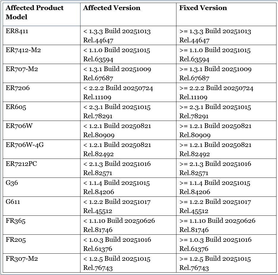 CVE-2025-6541 และ CVE-2025-6542 ส่งผลกระทบต่ออุปกรณ์ Omada gateways 13 รุ่นในเวอร์ชันเฟิร์มแวร์ดังต่อไปนี้ :