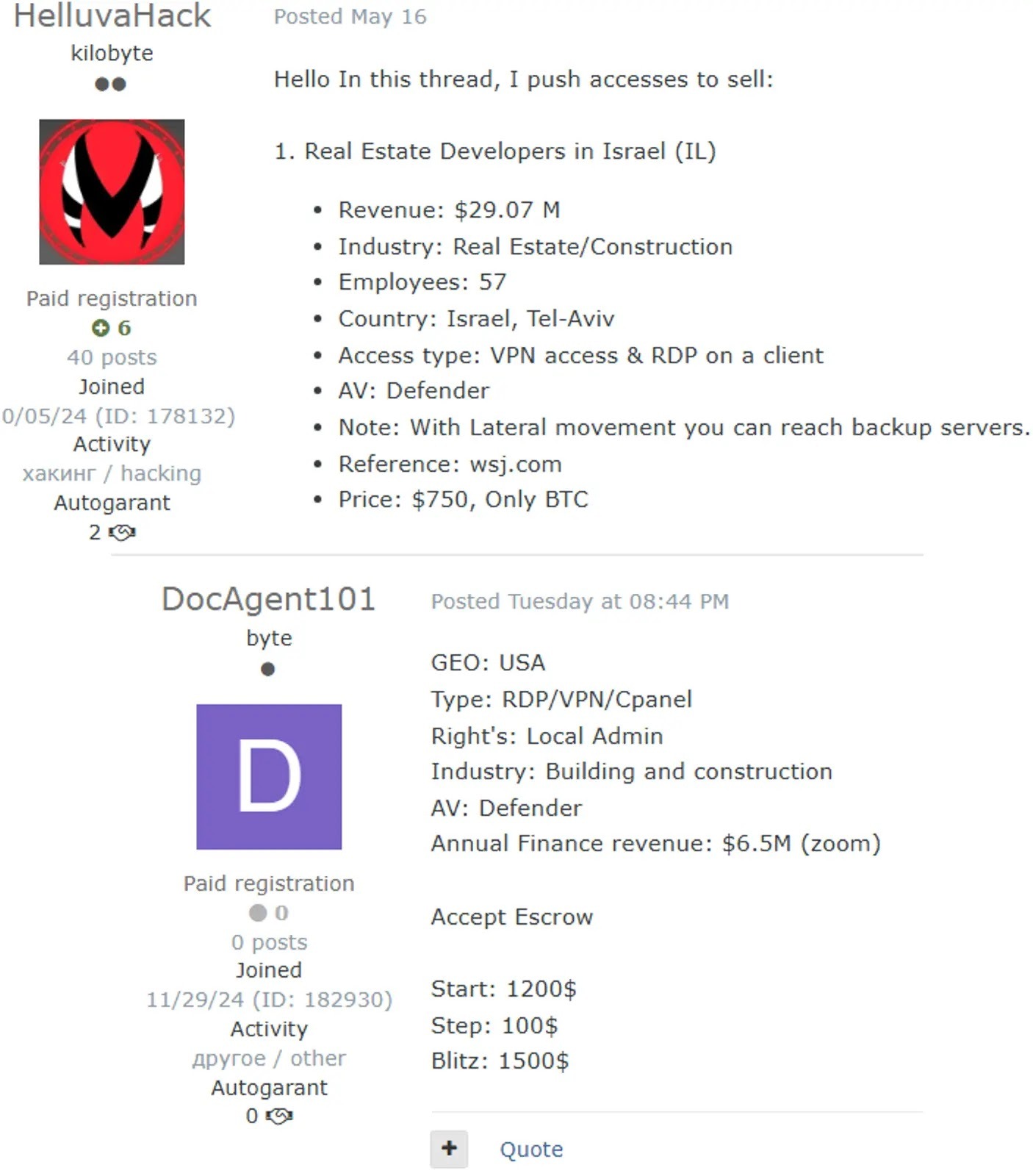 เหตุการณ์นี้แสดงให้เห็นอีกหนึ่งตัวอย่างของการเสนอขายสิทธิ์การเข้าถึง VPN, RDP และ Cpanel ของบริษัทก่อสร้าง ซึ่งแสดงให้เห็นถึงประเภทการเข้าถึงที่หลากหลายที่ผู้โจมตีอาจเข้าถึงได้