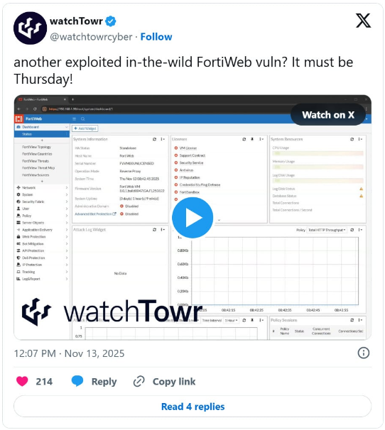 นักวิจัยด้านความปลอดภัยจาก watchTowr Labs ยืนยันช่องโหว่ดังกล่าว โดยได้โพสต์วิดีโอบน X ซึ่งแสดงให้เห็นความพยายามในการเข้าสู่ระบบ FortiWeb ที่ไม่สำเร็จ, การพยายามโจมตีช่องโหว่ และการเข้าสู่ระบบสำเร็จในฐานะผู้ดูแลระบบที่เพิ่งสร้างขึ้น