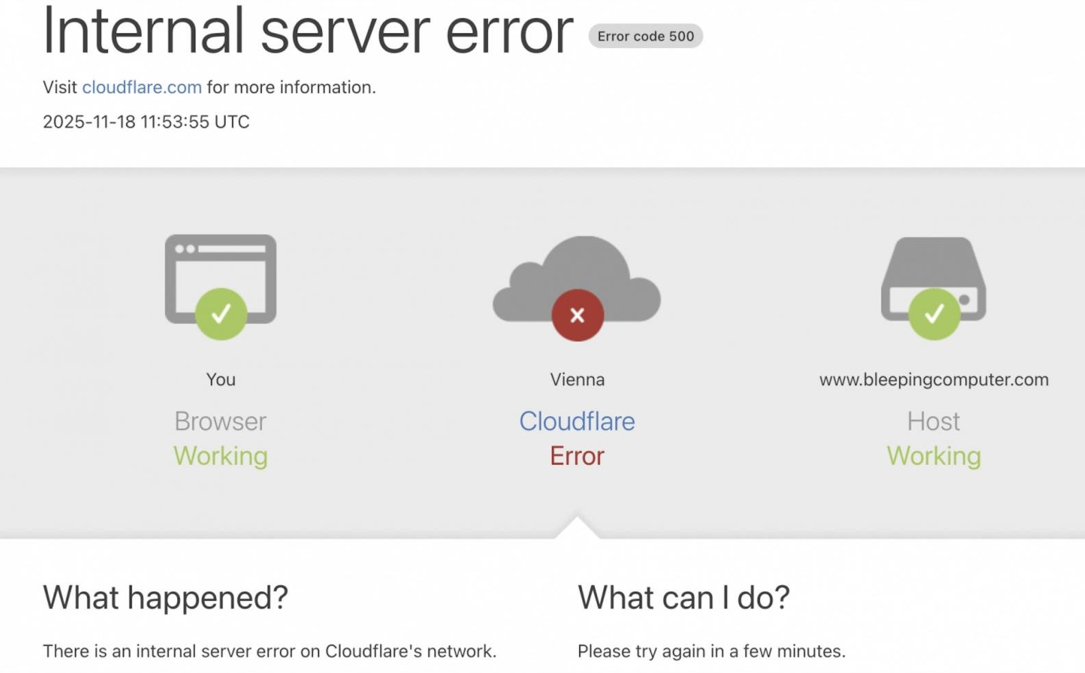 Cloudflare กำลังตรวจสอบปัญหาระบบล่ม ที่ส่งผลกระทบต่อบริการต่าง ๆ ทั่วโลก โดยผู้ใช้งานจะพบข้อความ "internal server error" เมื่อพยายามเข้าถึงเว็บไซต์ และแพลตฟอร์มออนไลน์ที่ได้รับผลกระทบ