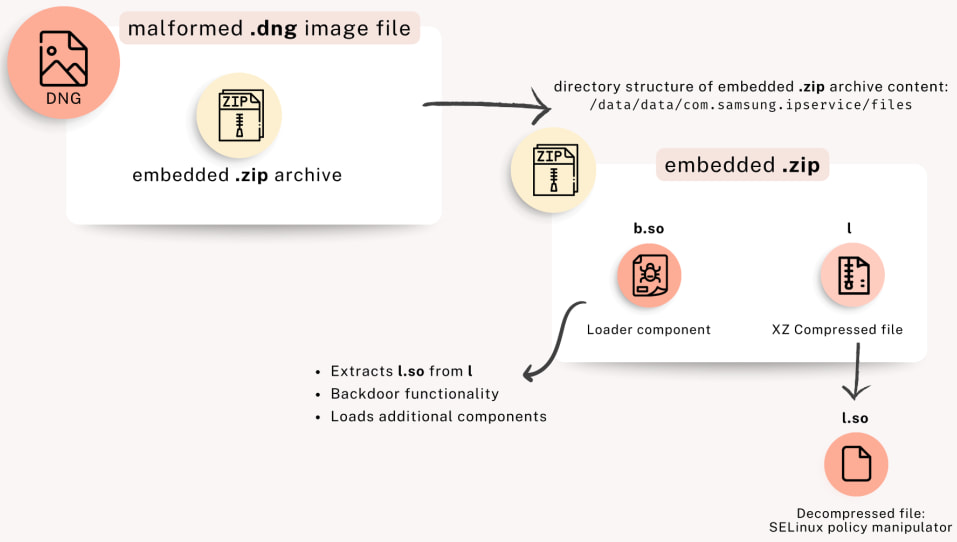 ในเชิงเทคนิค ไฟล์ DNG เหล่านี้ได้ฝังองค์ประกอบหลักไว้ 2 ส่วน คือ ตัว loader (b.so) ซึ่งทำหน้าที่ดึง และโหลดโมดูลเพิ่มเติม และตัว SELinux policy manipulator (l.so) ซึ่งจะแก้ไขการตั้งค่าความปลอดภัยบนอุปกรณ์ เพื่อยกระดับสิทธิ์ และฝังตัวอยู่ในระบบอย่างถาวร