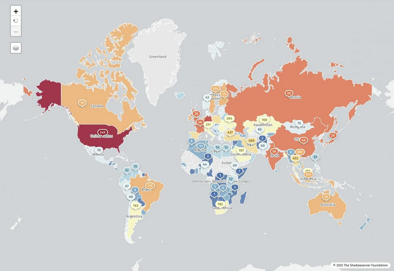 Shadowserver รายงานว่าได้ตรวจพบ IP จำนวน 77,664 รายการ ที่มีช่องโหว่ React2Shell โดยมีประมาณ 23,700 รายการในสหรัฐอเมริกา