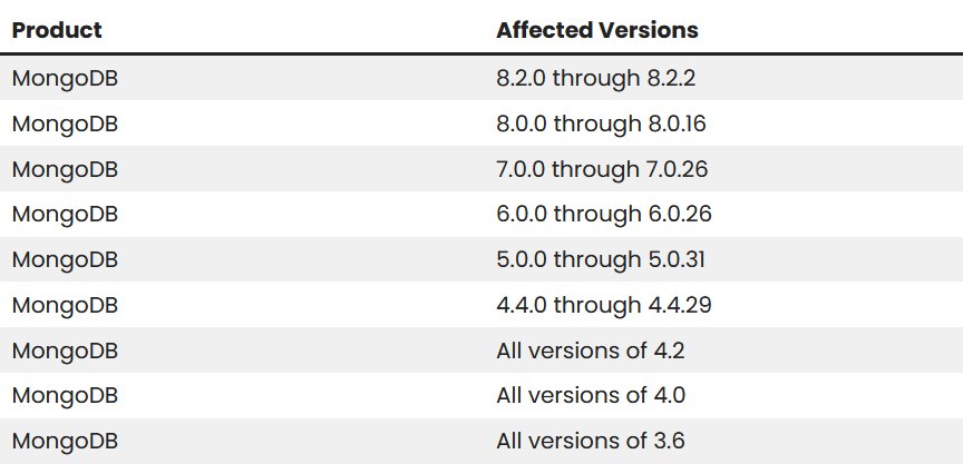 ช่องโหว่ดังกล่าวส่งผลกระทบต่อ MongoDB ในหลายเวอร์ชัน ซึ่งสามารถระบุในส่วนของเวอร์ชันหลักได้ดังนี้