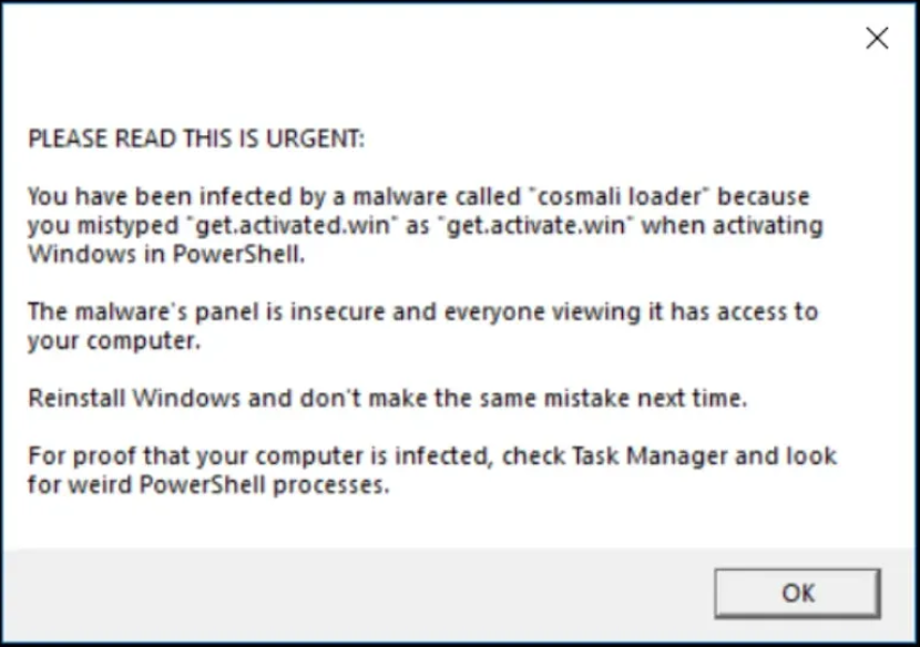"คอมพิวเตอร์ของคุณติดมัลแวร์ที่ชื่อ cosmali loader เนื่องจากคุณพิมพ์ชื่อโดเมนผิดจาก get[.]activated[.]win เป็น get[.]activate[.]win ในขณะที่ activate Windows ใน PowerShell