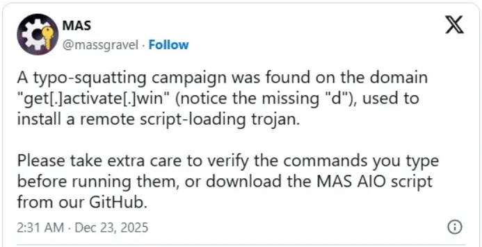 พบการใช้โดเมนที่สะกดผิด ซึ่งปลอมแปลงเป็นเครื่องมือ Microsoft Activation Scripts (MAS) ถูกนำมาใช้เพื่อแพร่กระจายสคริปต์ PowerShell ที่เป็นอันตราย และอาจทำให้เหยื่อติดมัลแวร์ที่ชื่อว่า Cosmali Loader