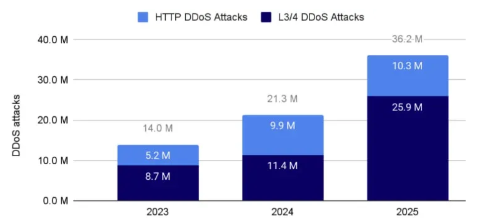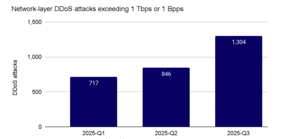 ข้อมูลทางสถิติจาก Cloudflare แสดงให้เห็นว่าการโจมตี DDoS แบบ hyper-volumetric จาก Aisuru Botnet เพิ่มขึ้นอย่างต่อเนื่องในปีนี้ โดยมีเหตุการณ์เกิดขึ้นถึง 1,304 ครั้งในไตรมาสที่ 3 เพียงไตรมาสเดียว