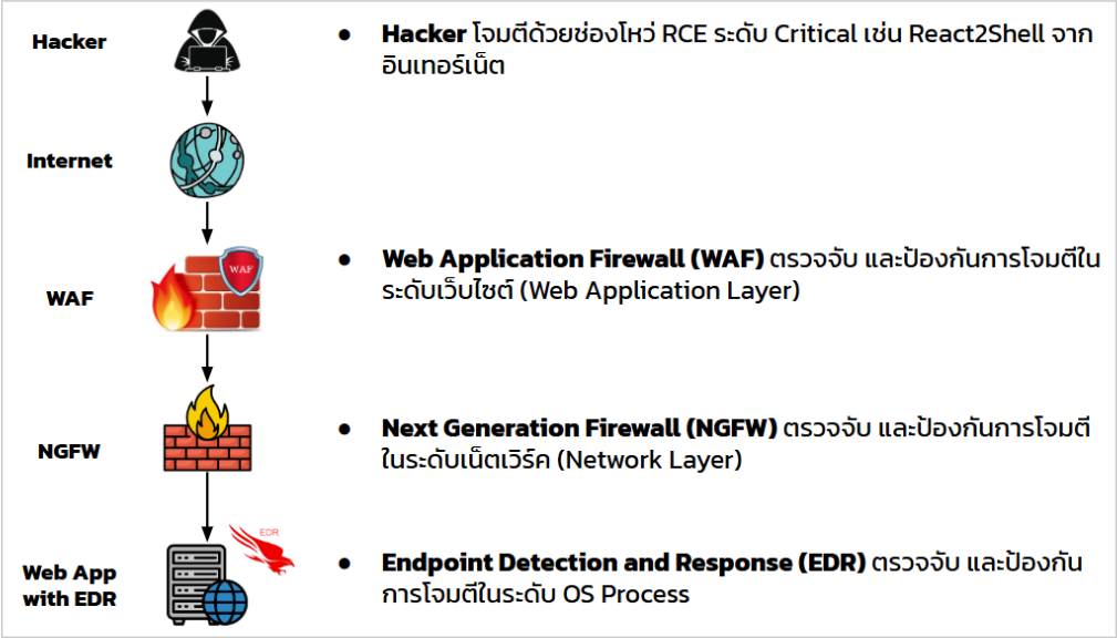 ดังนั้นการพึ่งพาเพียงแค่การป้องกันระบบด้วยอุปกรณ์ใดอุปกรณ์หนึ่ง อาจไม่เพียงพอต่อการป้องกันการโจมตีได้อย่างสมบูรณ์ หากระบบขององค์กรกำลังถูกโจมตีจากช่องโหว่ React2Shell หรือช่องโหว่อื่น ๆ ในลักษณะคล้ายกัน การนำ Defense in Depth Concept เช่น การใช้งาน WAF ร่วมกับ EDR คืออีกหนึ่งตัวช่วยที่เข้ามาช่วยตรวจจับ, ยับยั้ง หรือชะลอการโจมตีได้ ซึ่งถือเป็นมาตรการป้องกันระหว่างที่องค์กรยังไม่สามารถอัปเดตแพตซ์ได้ รวมไปถึงเป็นมาตรการป้องกันสำหรับช่องโหว่ในลักษณะคล้ายกันในอนาคต