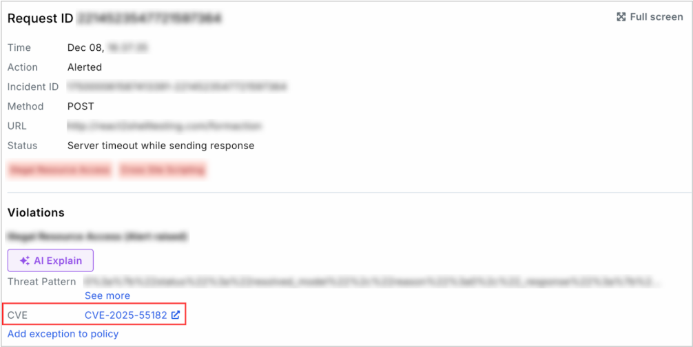 ภาพการตรวจจับการโจมตี React2Shell จาก WAF Signature CVE-2025-55182