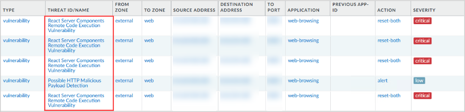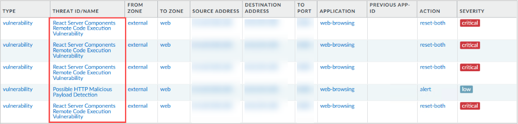 โดยเมื่อตรวจสอบที่อุปกรณ์ NGFW (ที่มีการเพิ่มการ Decrypt SSL ของเว็บไซต์ไว้แล้ว) ก็พบว่าอุปกรณ์ยังสามารถตรวจจับการโจมตีในรูปแบบ React2Shell ได้ด้วย Threat Signature “React Server Components Remote Code Execution Vulnerability” เช่นเดียวกับ Exploit ในครั้งแรก